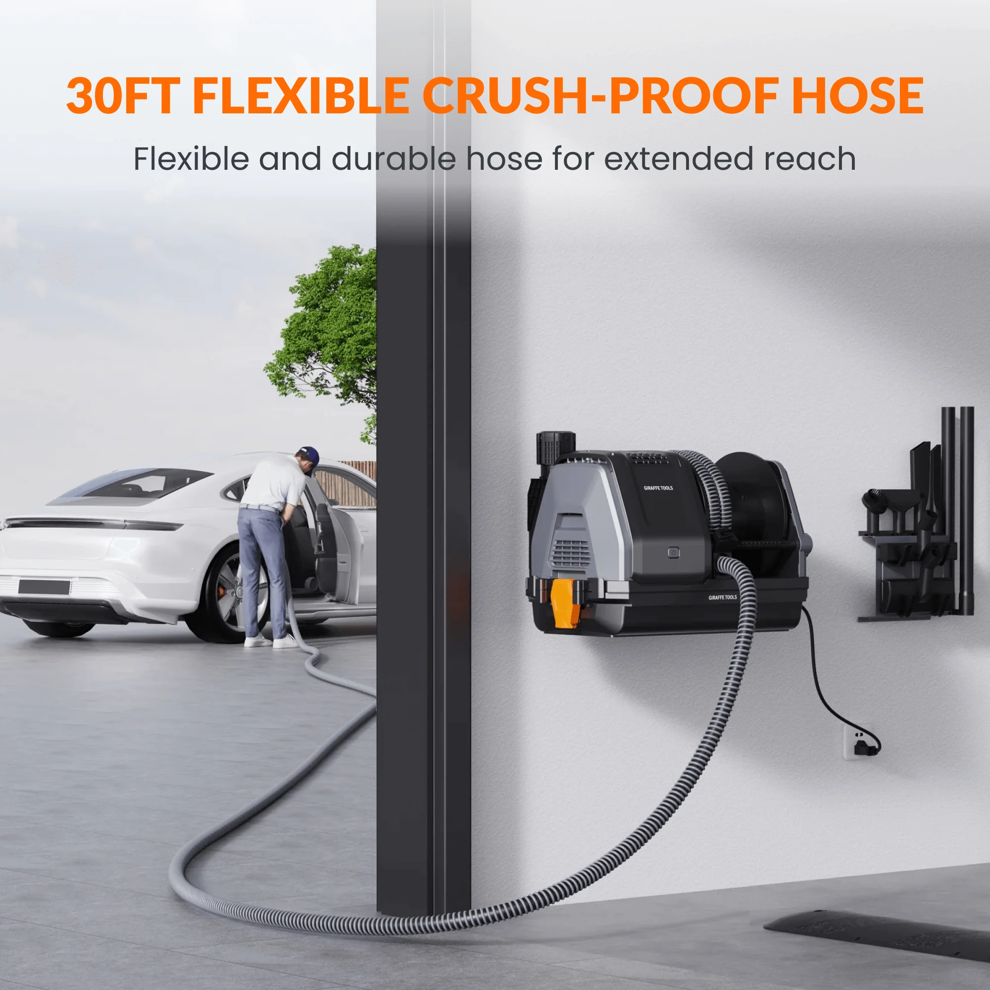 Vacuum with ease, store with breeze and effortlessly have it all in one. Stylish and space-saving, the wall-mounted design facilitates every use. With a 10M hose, effortlessly reach every corner -simply pull it out for instant use. Wet/Dry Use, Versatile Clean. Breezy Retraction, Automatically Tidy.
